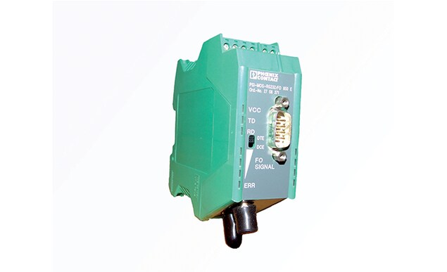 Fibermodem til overførsel af data via optisk fiber. Modemmet tilsluttes RS232-porten på en eNode eller direkte til brandcentralen, afhængigt af netværkets opbygning. Skruetilslutning for strømforsyning og potentialfri udgang for fejl. Modemmet har lysdioder til signalstyrke for fiber og status samt DTE-/DCE-afbryder (2-3 drejeben (Rx-Tx) på RS232-porten) ST-konnektorer til tilslutning af multi-mode-fiberkabel 50/125 eller 62,5/125.